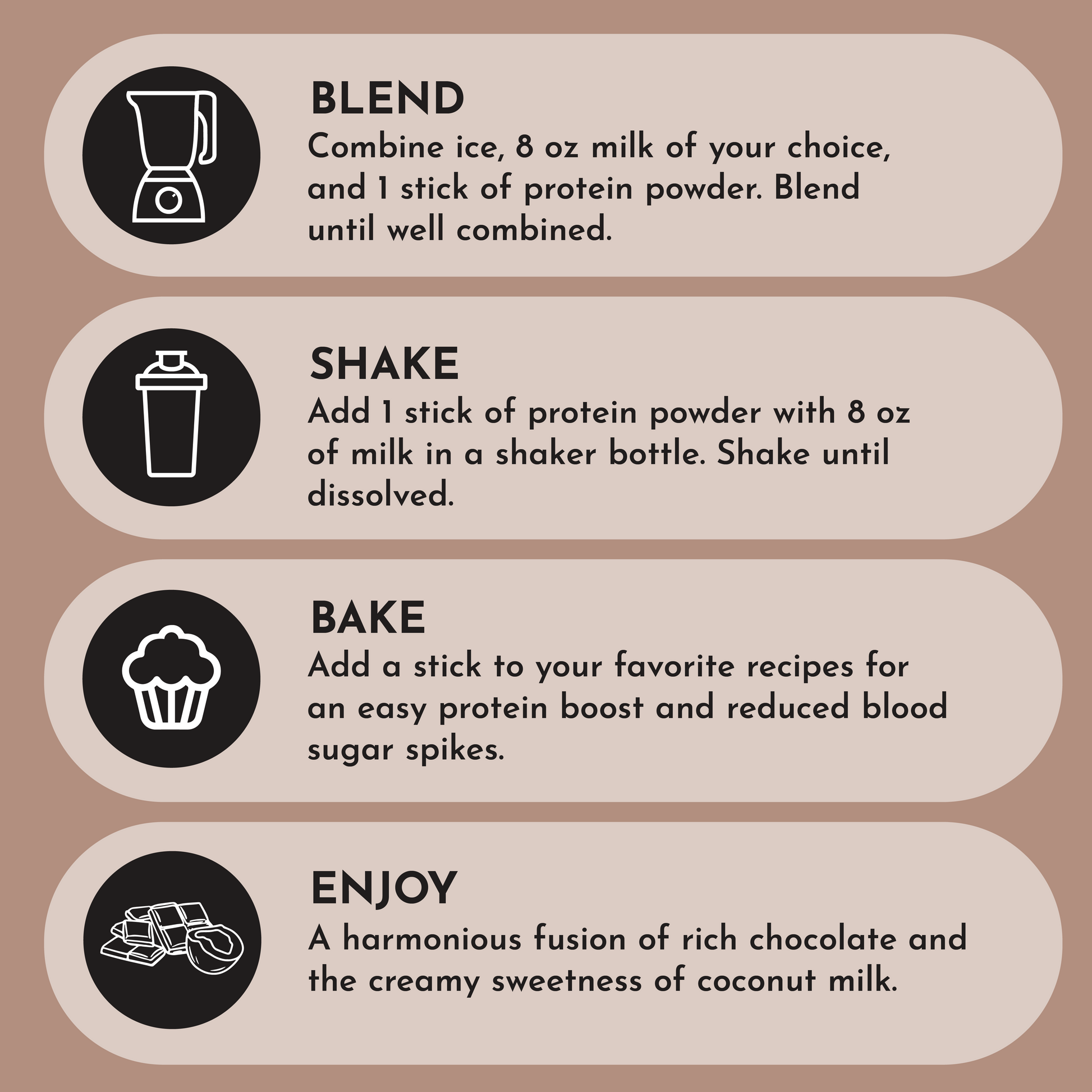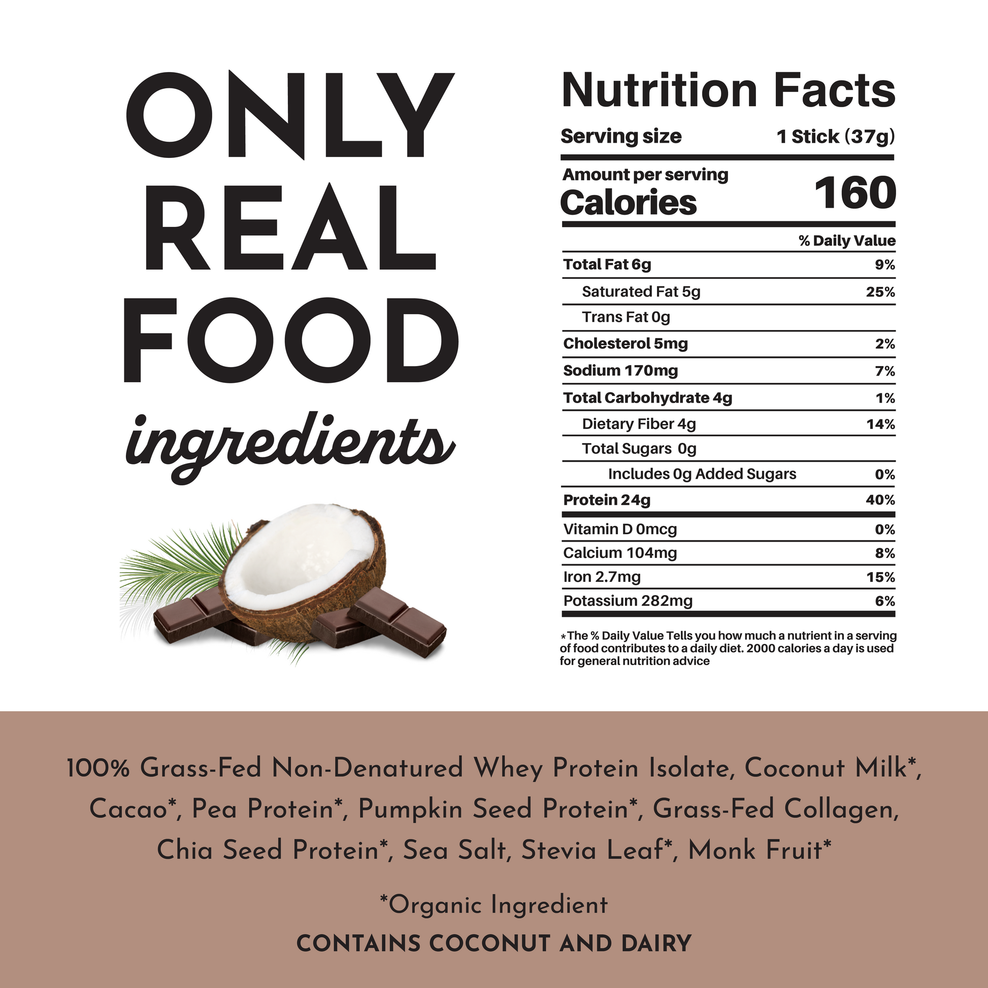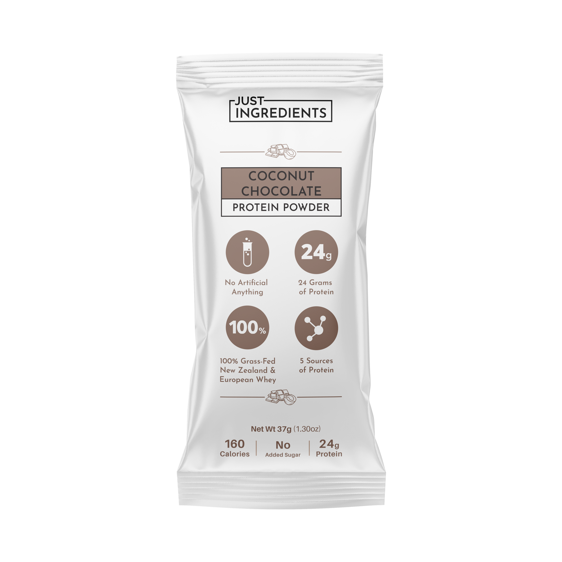 A deliciously creamy chocolate and coconut protein powder made with five different protein sources and flavored without artificial sweeteners or sugar alcohols. Made with non-denatured 100% grass-fed non-denatured whey from New Zealand.