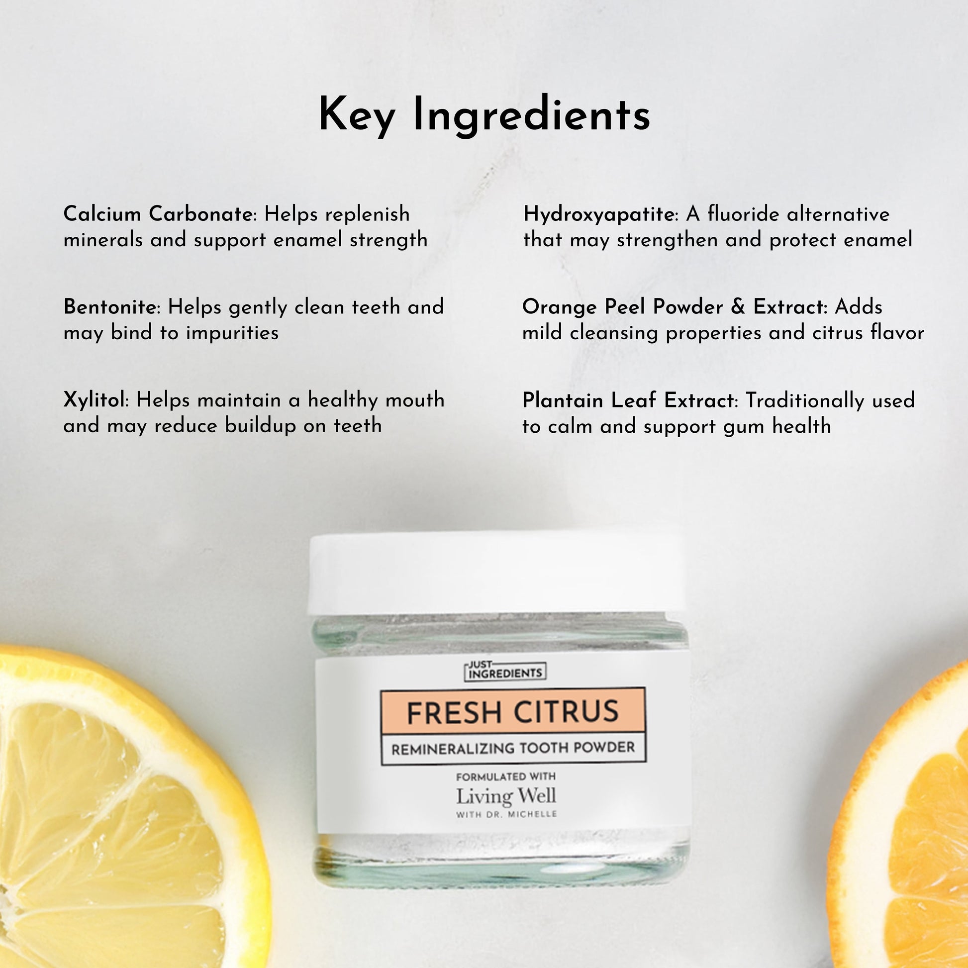 Calcium Carbonate, Xylitol, Bentonite, Hydroxyapatite, Citrus Aurantium Dulcis (Orange) Peel Powder, Citrus Aurantium Dulcis (Orange) Peel Oil, Plantain (Plantago Major) Leaf Extract