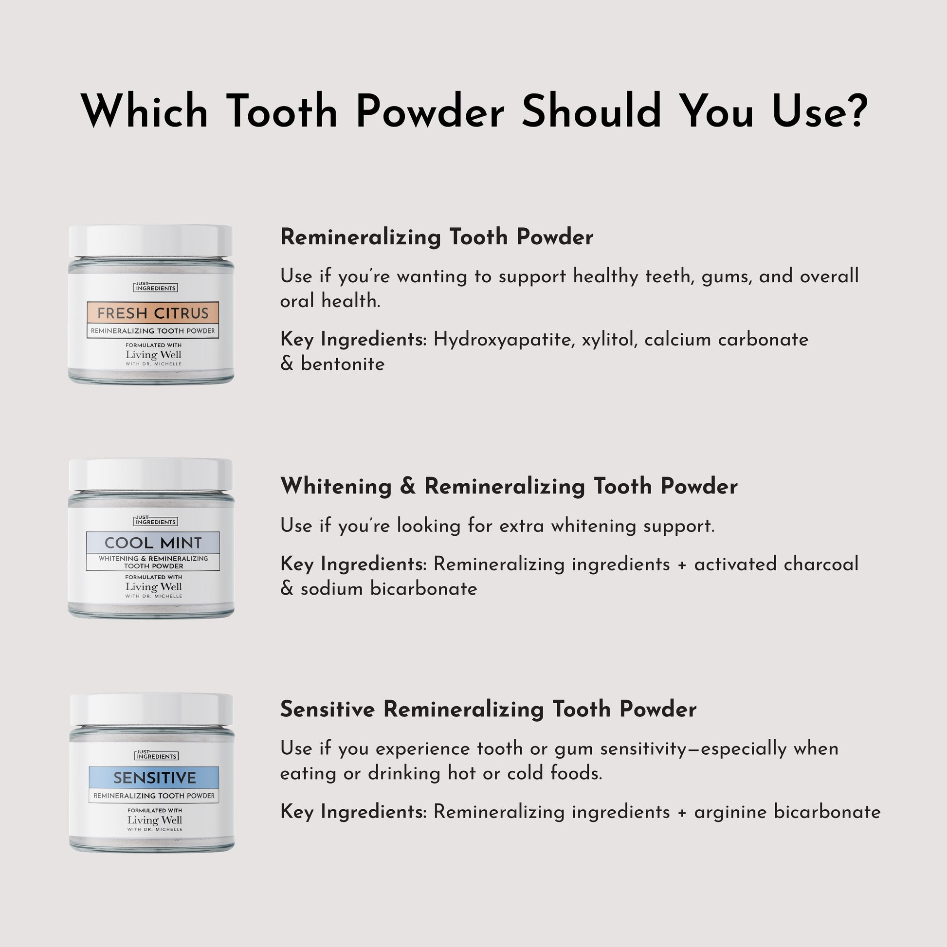 We chose to create a tooth powder with hydroxyapatite to help the teeth absorb as much as possible for maximized remineralization benefits.
