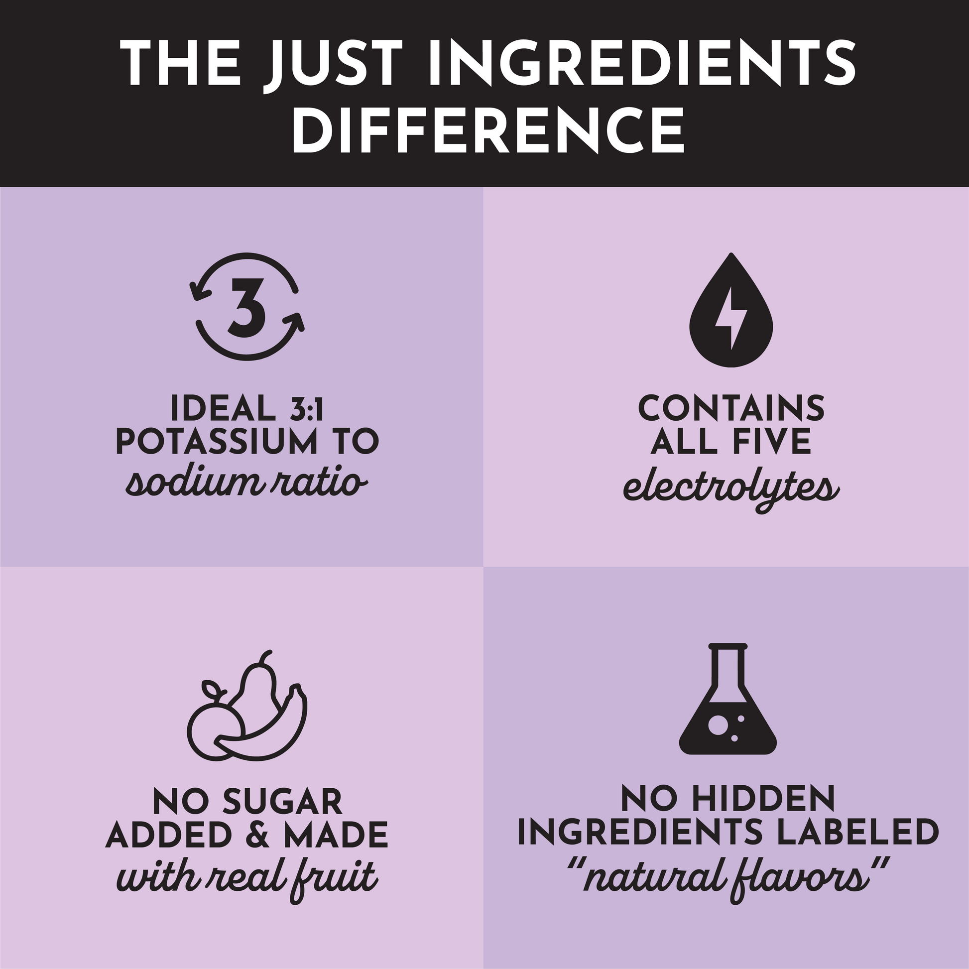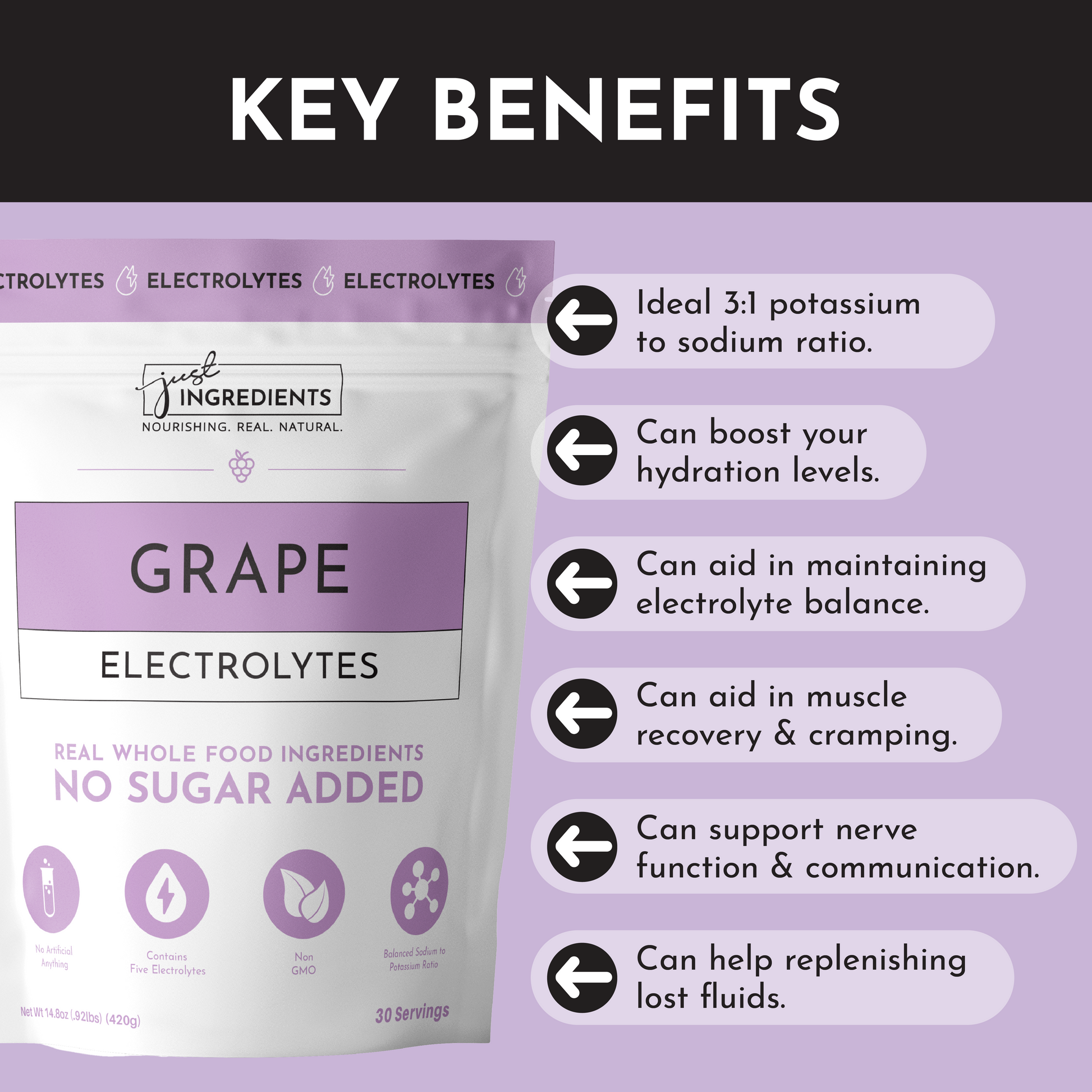 Refreshing and flavorful Grape Electrolytes made with five different sources of electrolytes and flavored without artificial sweeteners or sugar alcohols. With a balanced 3:1 potassium to sodium ratio, you’ll be able to enjoy optimal hydration without excessive sodium levels. Whether you're an athlete or simply seeking optimal hydration, choose our electrolytes for a natural and tasty experience that fuels your body.