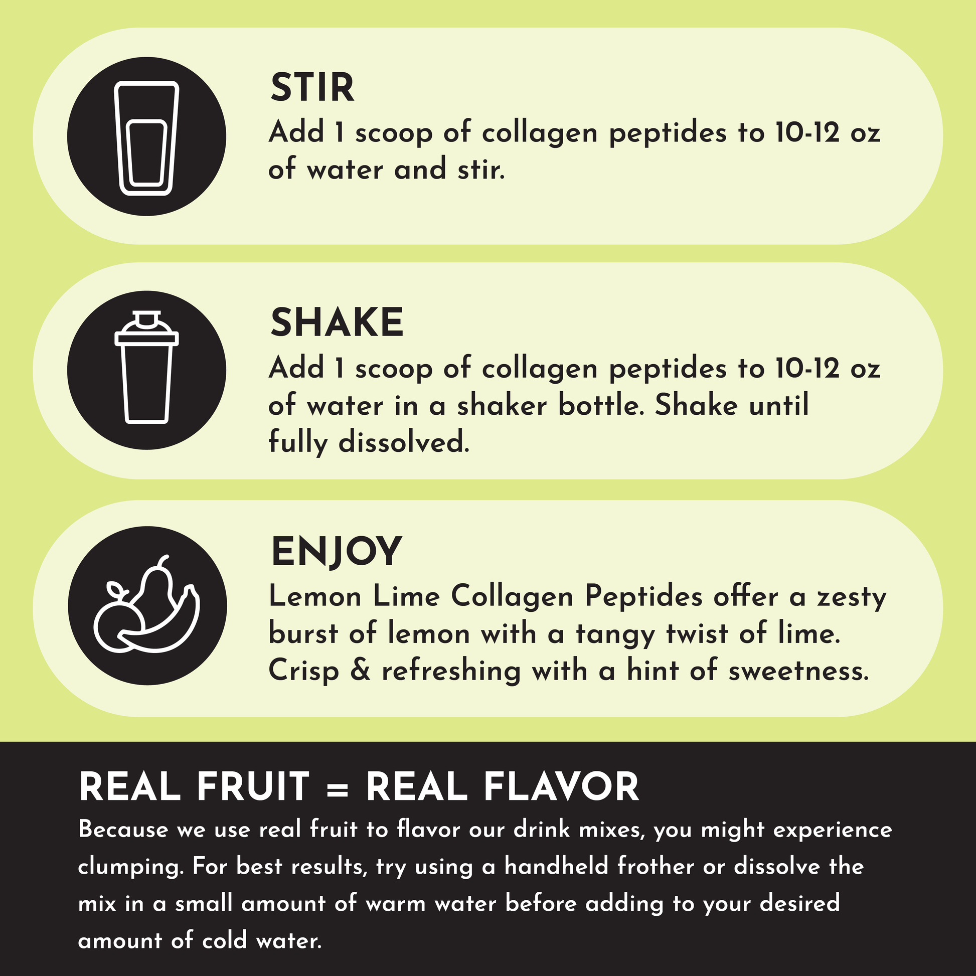 Introducing Lemon Lime Collagen Peptides. Packed in a convenient 30-serving bag, this drink powder delivers a collagen packed, refreshing lemon lime treat.