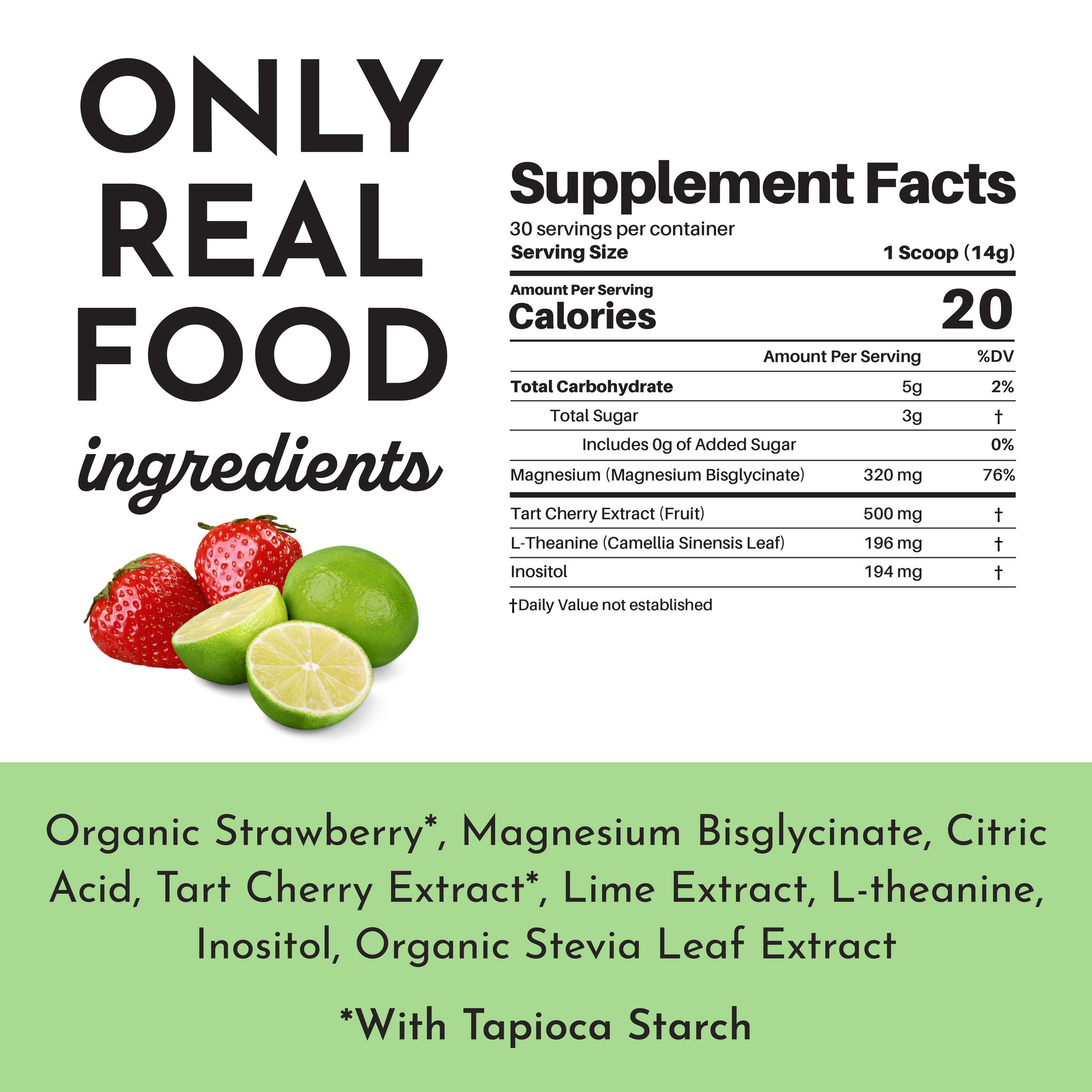 Magnesium (Bisglycinate), Tart Cherry Extract, L-Theanine, Inositol, Strawberry* (Strawberry*, Tapioca Starch), Citric Acid (Cassava Root), Lime Extract, Stevia Leaf*