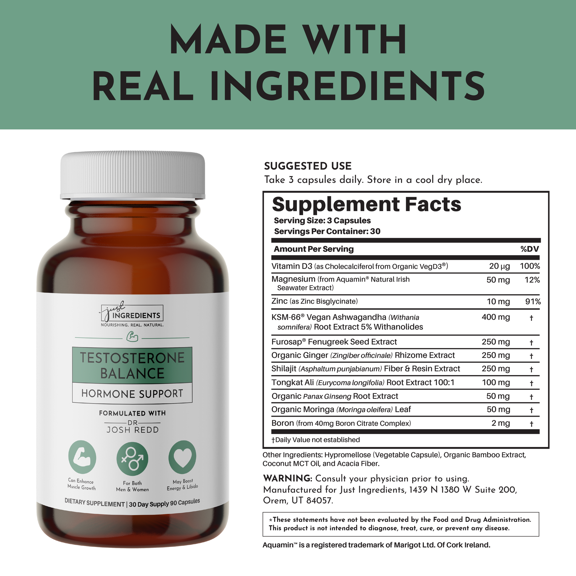 Just Ingredients Testosterone Balance is thoughtfully formulated for both men and women to support balanced testosterone levels, energy, mood, and muscle strength.* It features KSM-66® Ashwagandha—a high-concentration, full-spectrum extract clinically studied for supporting male fertility and testosterone levels†—and Furosap® Fenugreek to help maintain healthy testosterone levels.* The formula also includes traditionally used herbs known to support vitality and sexual health, such as tongkat ali, shilajit, and organic Panax Ginseng, along with essential nutrients like zinc, magnesium, and vitamin D as patented VegD3®.*