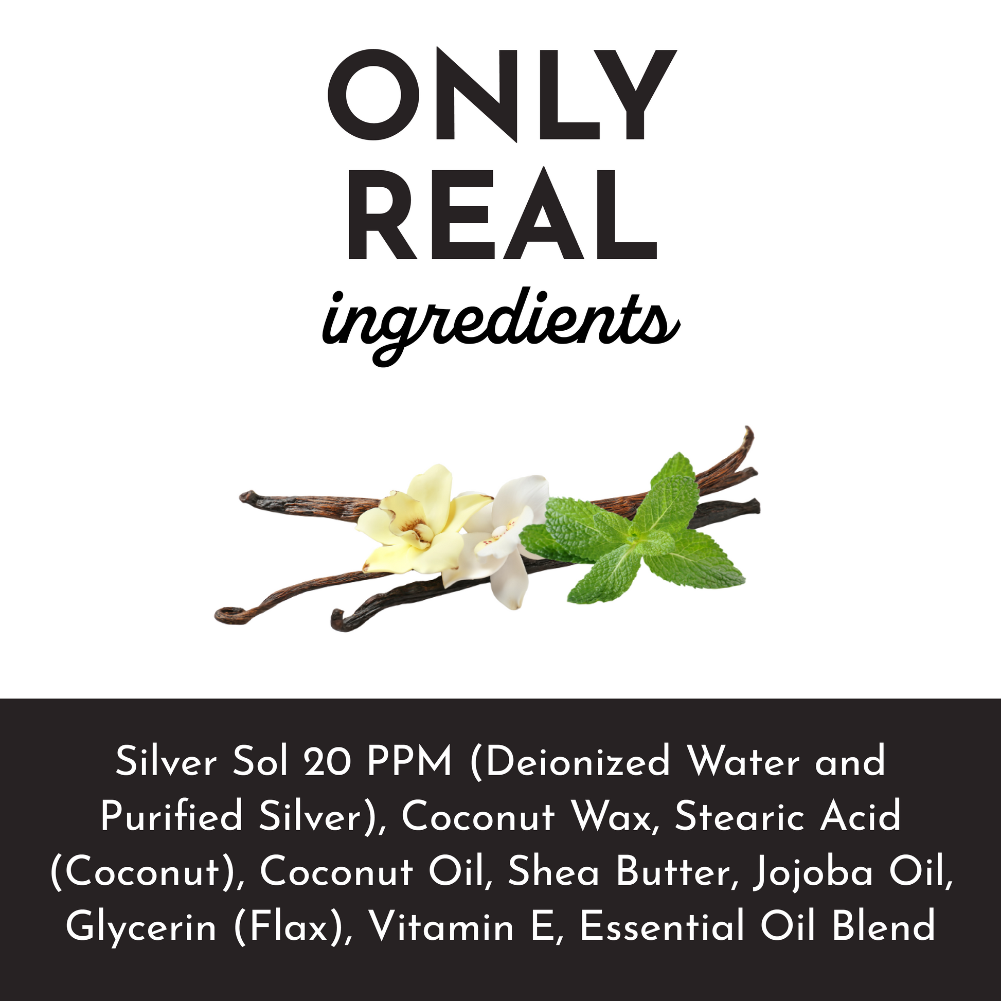 Silver Sol 20 PPM (Deionized Water and Purified Silver), Coconut Wax, Stearic Acid, Coconut Oil, Shea Butter, Jojoba Oil, Glycerin, Vitamin E, Essential Oil Blend